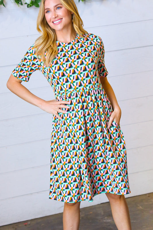 Aqua & Pink Fit & Flare Geometric Midi Dress
