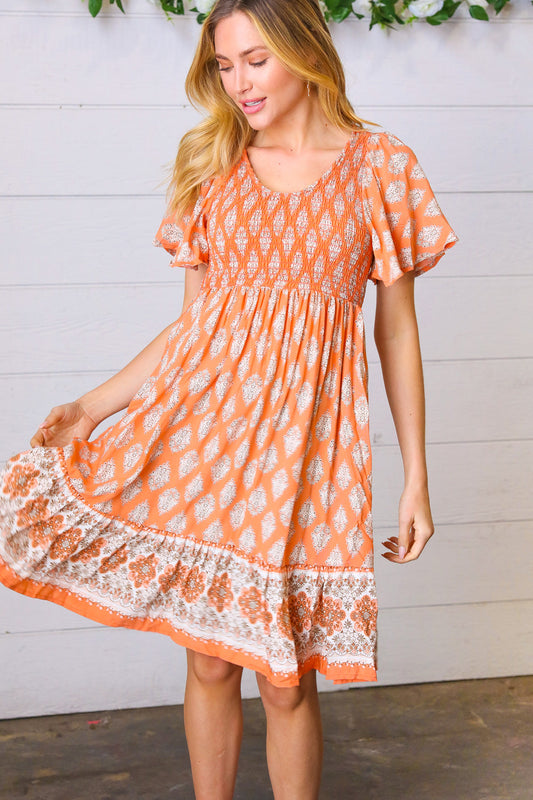 Apricot Paisley Fit and Flare Smocked Midi Dress