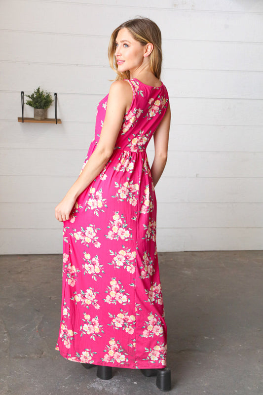 Yellow & Fuchsia Floral Fit and Flare Sleeveless Maxi Dress