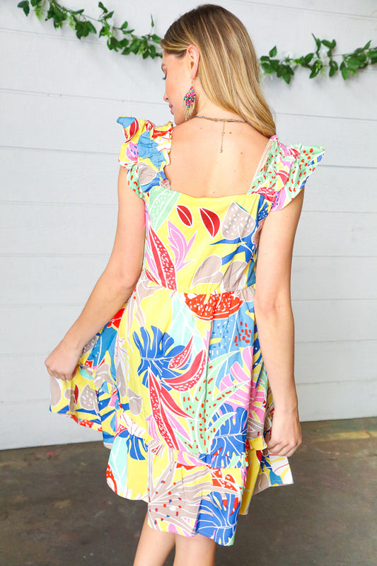 Yellow Tropical Print Ruffle Lined Drawstring Dress