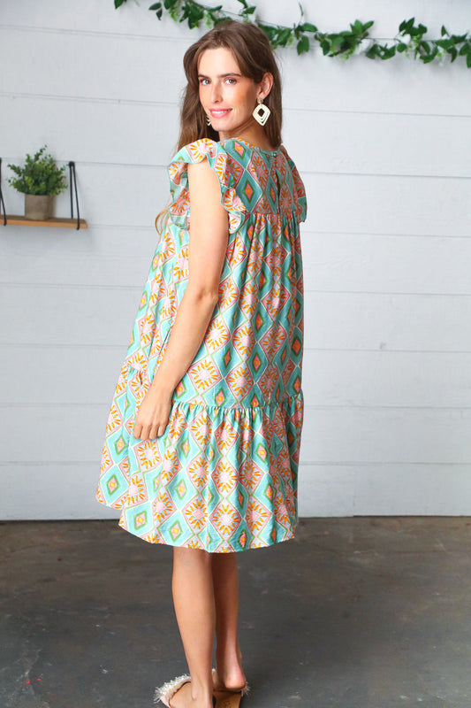 Mint Geo Boho Print Yoke Poplin Woven Dress
