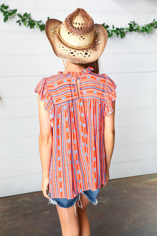 Red & Blue Boho Stripe Flutter Sleeve Top