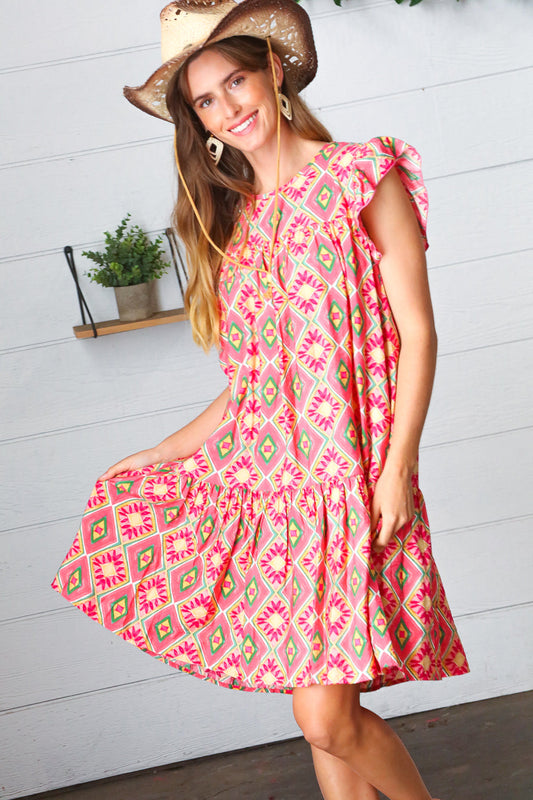 Coral Geo Boho Print Yoke Poplin Woven Dress