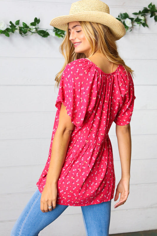 Fuchsia Floral Babydoll Button Down Woven Top