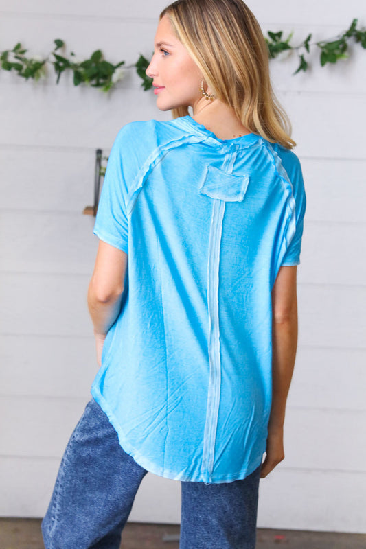Washed Blue Raw Edge Short Sleeve Top