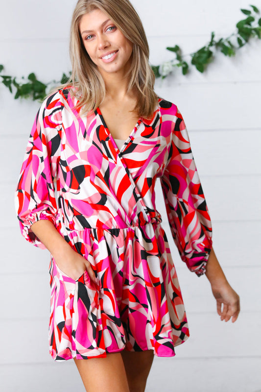 Magenta & Cherry Red Geometric Surplice Romper