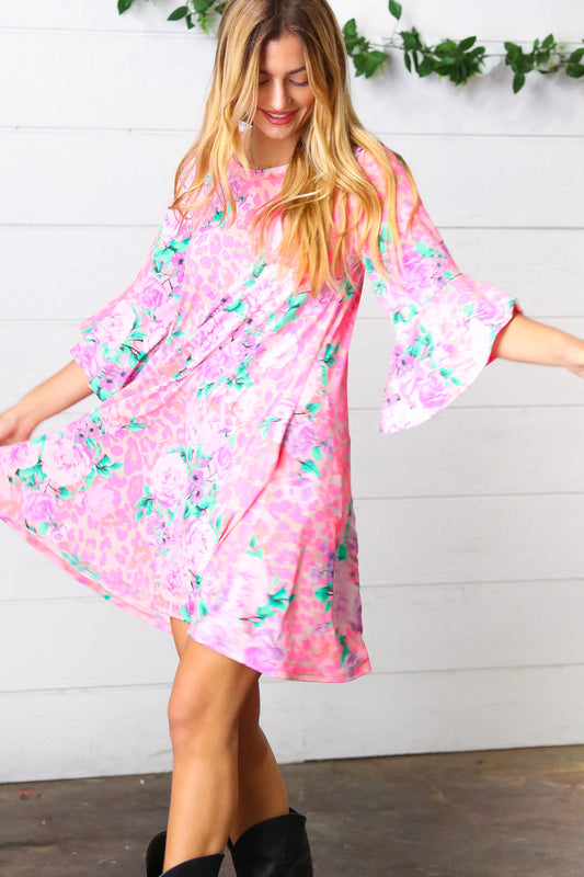 Pink Floral & Animal Print Bell Sleeve Dress