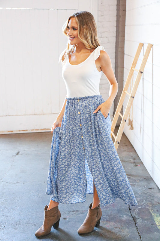 Cream/Denim Two Fer Slit Frill Button Detail Maxi Dress