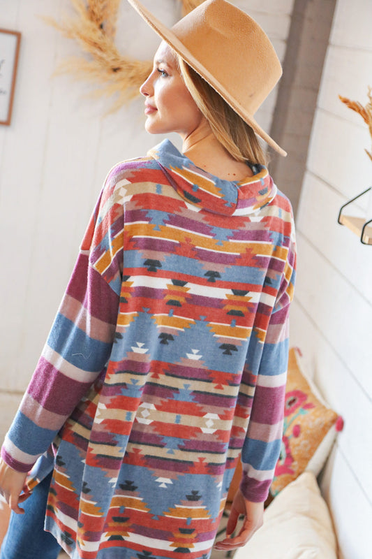 Blue/Multicolor Hacci Aztec Print Side Slit Pullover