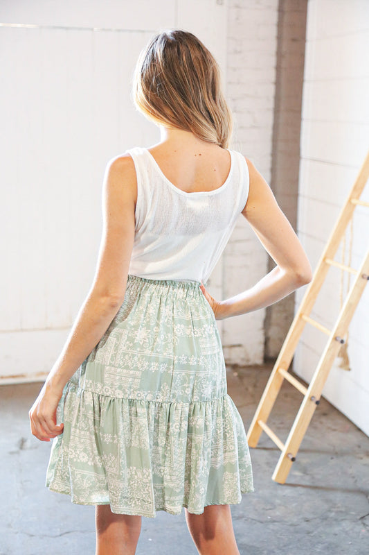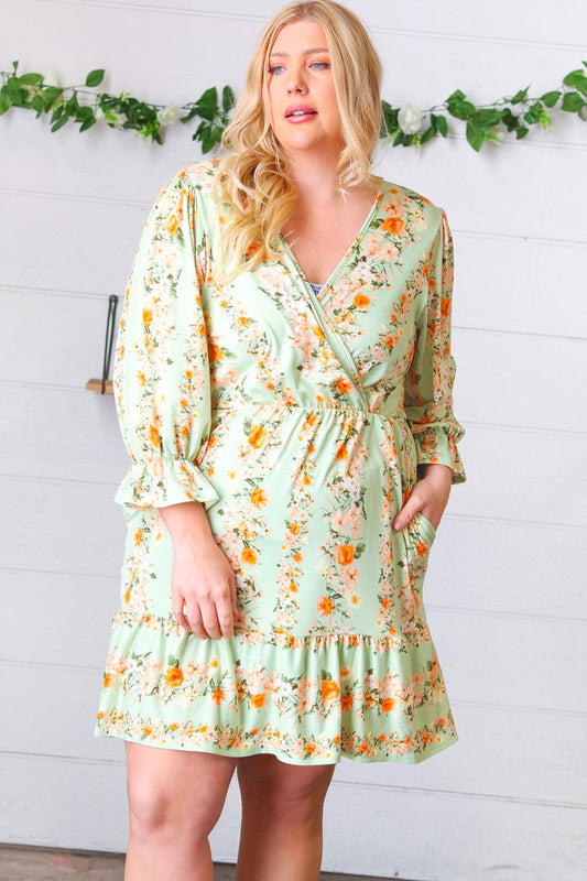Mint Floral Stripe Surplice Neck Ruffle Dress