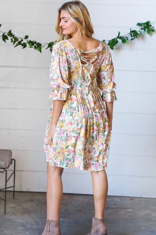 Cream Pointelle Button Detail Boho Elastic Frill Waist Dress