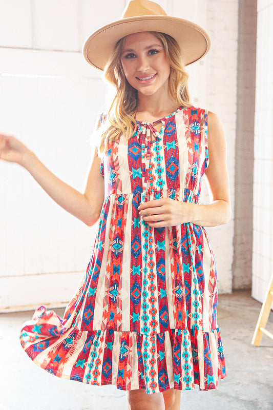 Orange/Blue Ethnic Aztec Tiered Front Tie Ruffle Dress