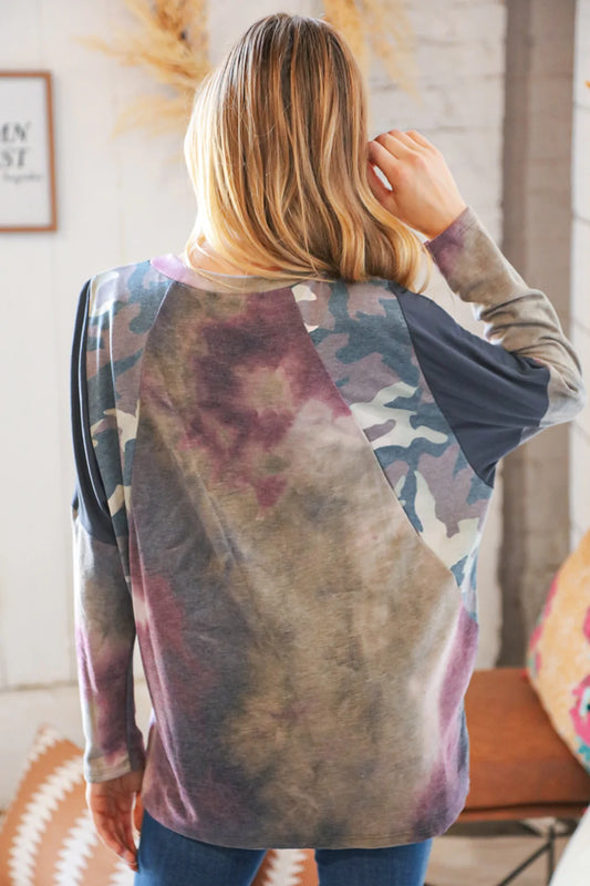 BURGUNDY & OLIVE TIE DYE CAMO RAGLAN BLOUSE