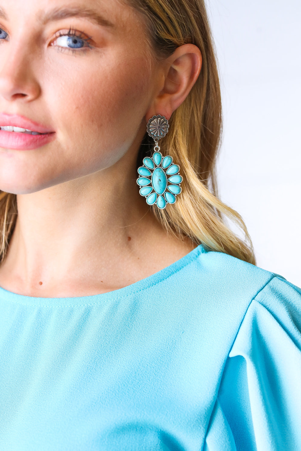 Add classy casual and chic to your accessory ensemble with these trendy metal floral turquoise stone drop pendant earrings. A must have design for the fall!